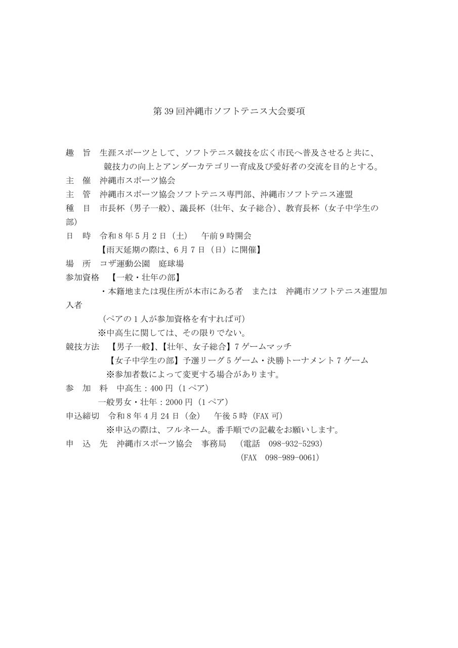 第39回沖縄市ソフトテニス大会を開催いたします。