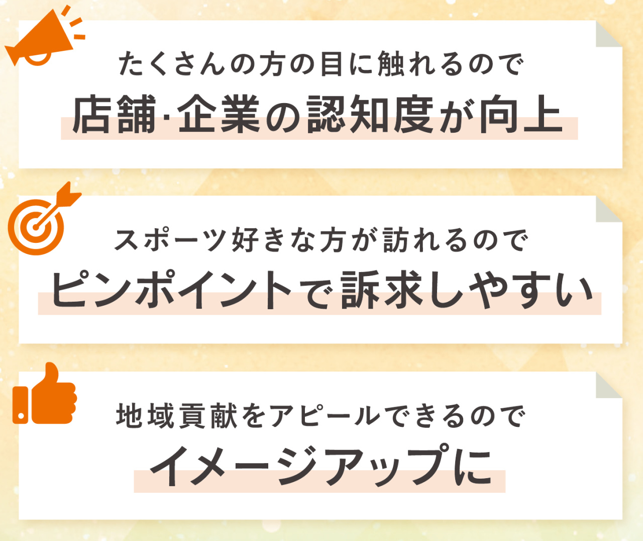当ホームページは沖縄市周辺地域だけでなく、地域外からも沢山のアクセスがあります。広告バナーを掲載することで沢山の方々へのPRに繋がりますし、エリアマーケティングに力を入れたい店舗・企業にピッタリです。またチラシのポスティングと同様の効果も期待出来ます。スポーツ応援を通して地域社会への貢献にも繋がります。なによりも応援することで地域の皆様からの応援が帰ってきます。